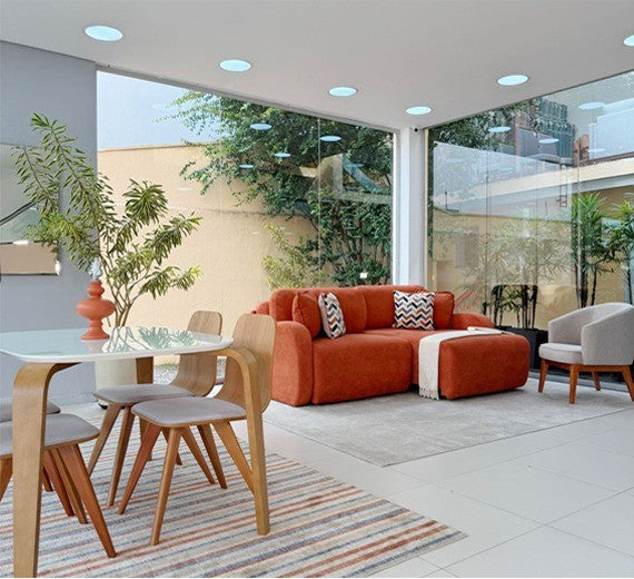 Sofá bonito mesmo com gatos em casa. O Tecido PróGato é resistente a arranhões, não acumula pelos e é fácil de limpar — conforto e tranquilidade no dia a dia.