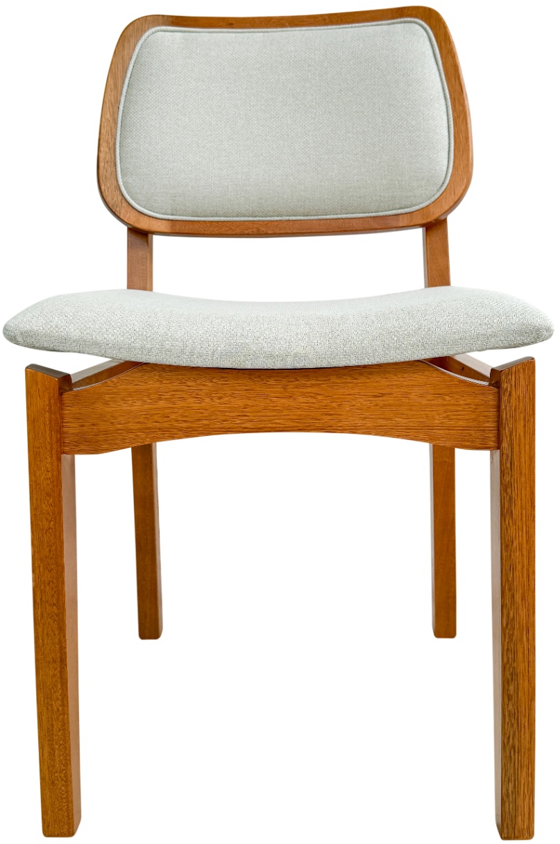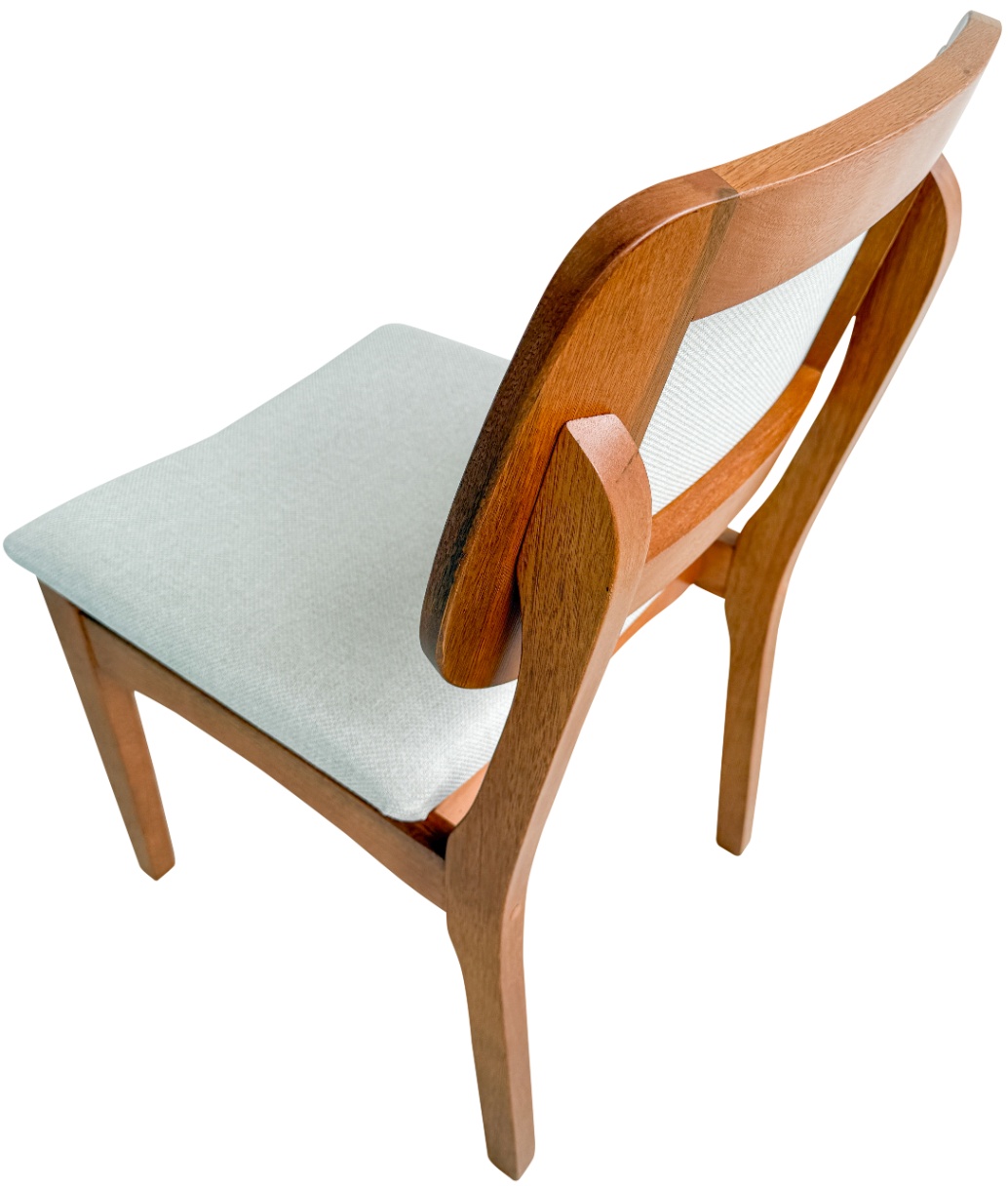O encosto é confortável em tecido linho. O assento, também estofado com o mesmo tecido, proporciona maciez e ergonomia para o uso diário. As linhas retas e os cantos levemente arredondados reforçam o equilíbrio entre tradição e modernidade no design.